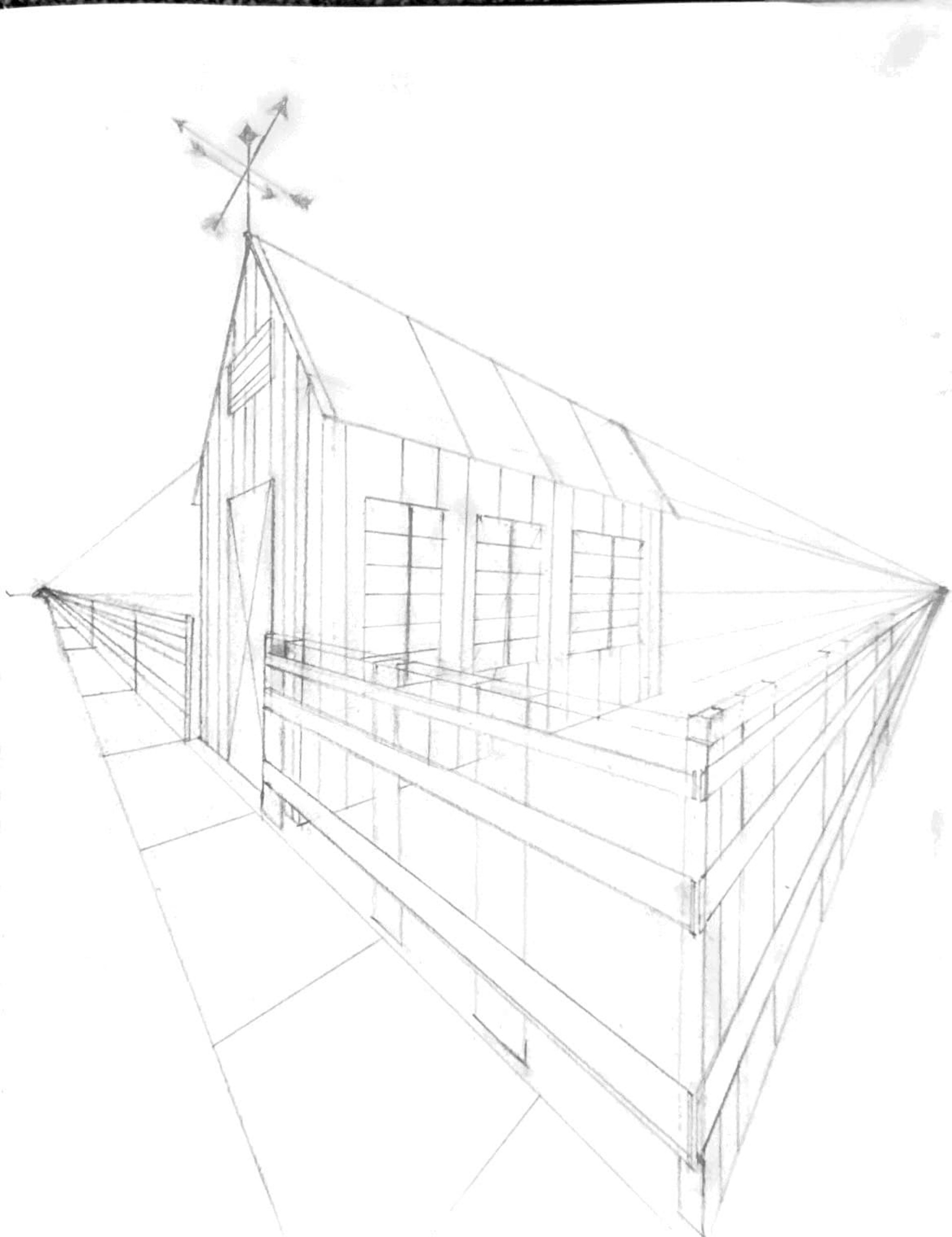 Two-Point Perspective Witchy Birdhouse in Space, graphite and charcoal, 2025